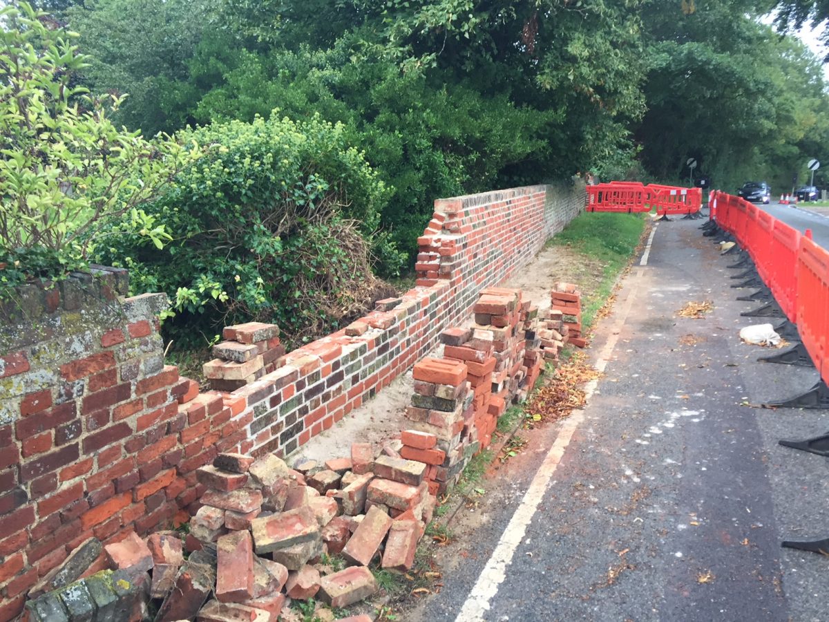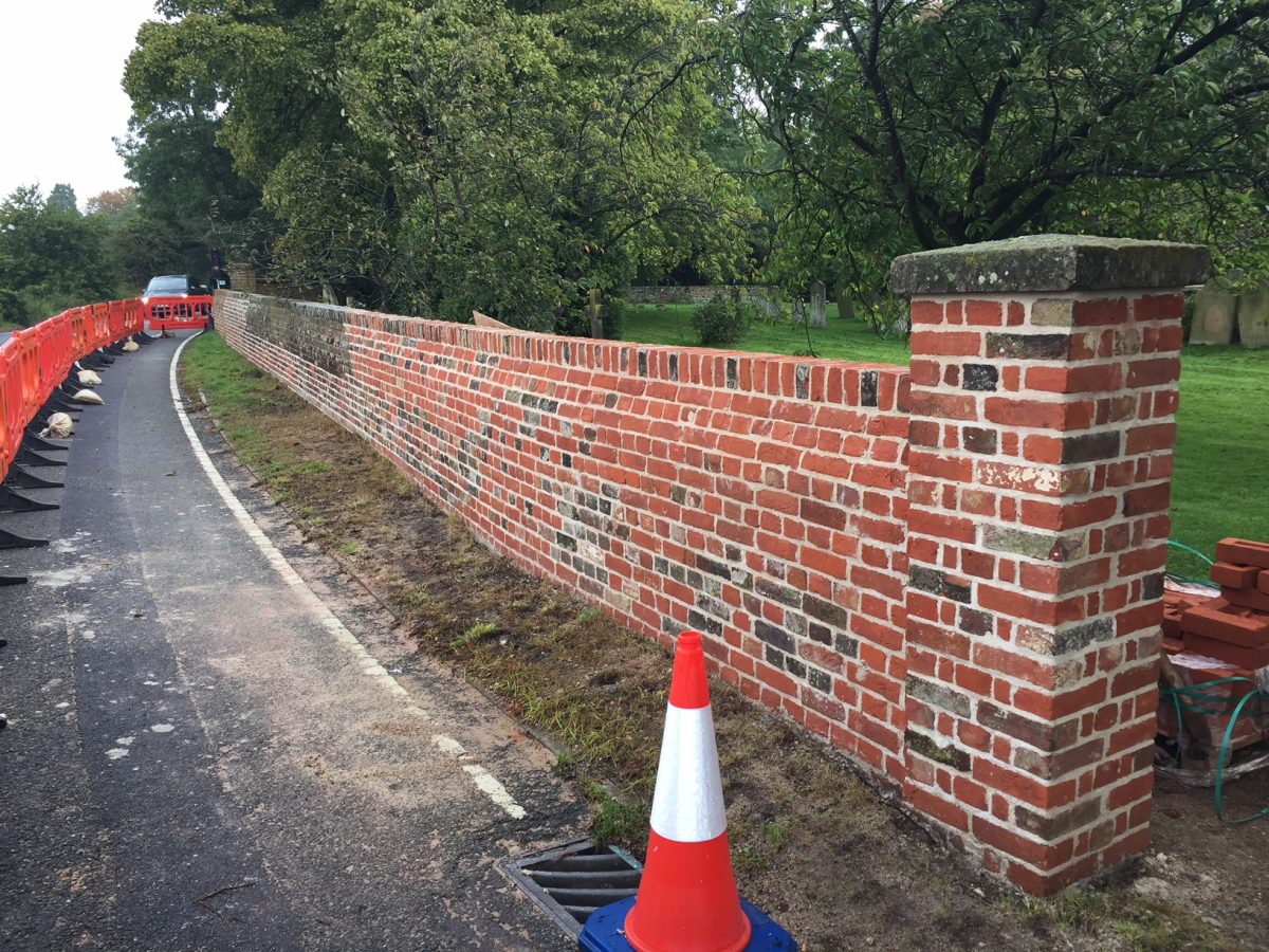 Falcon Structural Repairs has recently completed works to an East Hertfordshire historic church boundary wall. The contract involved partial rebuilding works following several recent vehicle impacts and general maintenance work. Due to the Local Authorities Listed Building requirements all the repairs were undertaken using traditional lime mortars and carefully selected reclaimed bricks from specialist period building suppliers. A road traffic management plan was implemented during the works to enabled Falcons team to work safely close to the highway and allowing the road still to be passable to traffic.